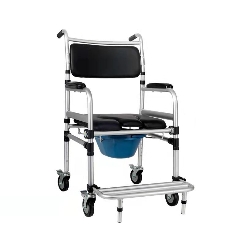 This foldable shower commode chair combines toilet, bathing, and mobility support in one unit. The sturdy design includes a padded seat, locking wheels, and a foldable frame, making it convenient for homes and care centers alike. Ensures dignity and comfort for elderly users.